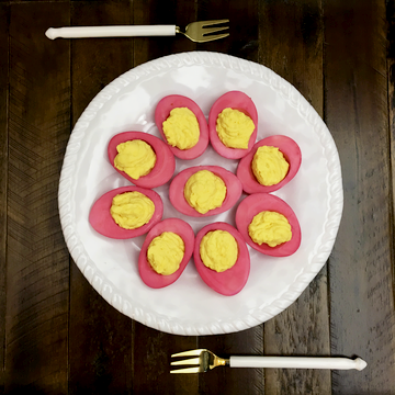 Remove egg whites from beet mixture and pat dry - they should be pink now! Spoon yolk mixture into egg whites and refrigerate in a sealed container until ready to eat.